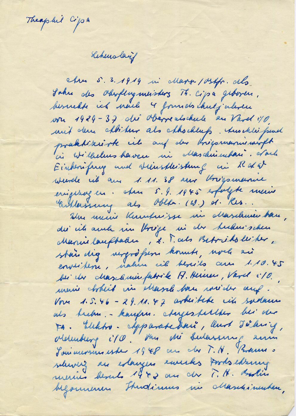 Es geht bei den folgenden Dokumenten im Wesentlichen um unseren Vater Theophil Cipa junior.